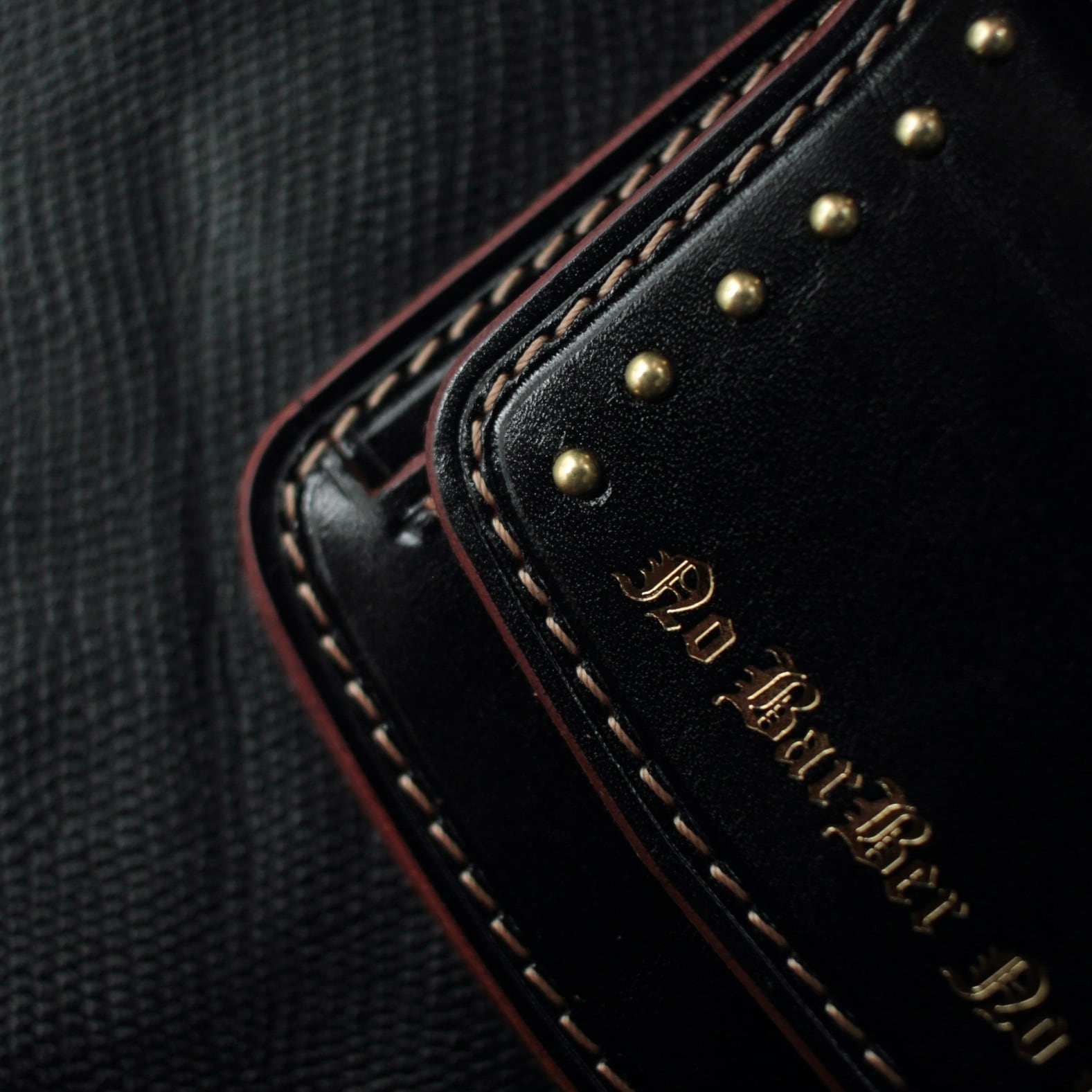 真鍮またはシルバー系スタッズを使用し、クラシックかつ無骨な印象に仕上げます。